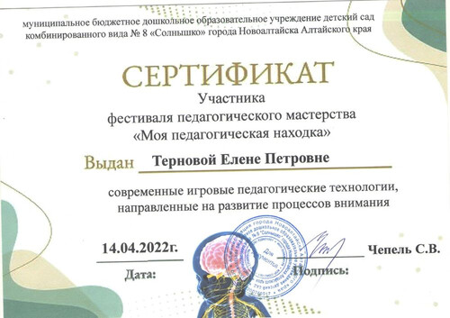Главная | Наша жизнь | Фотогалерея | Терновая Алена Петровна | Мои достижения | Сертификат Терновая ЕП