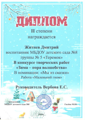 Главная | Наша жизнь | Фотогалерея | Вербова Евгения Сергеевна | Достижения детей | 2026г., Диплом Житнев Д.,Вербова Е.С.